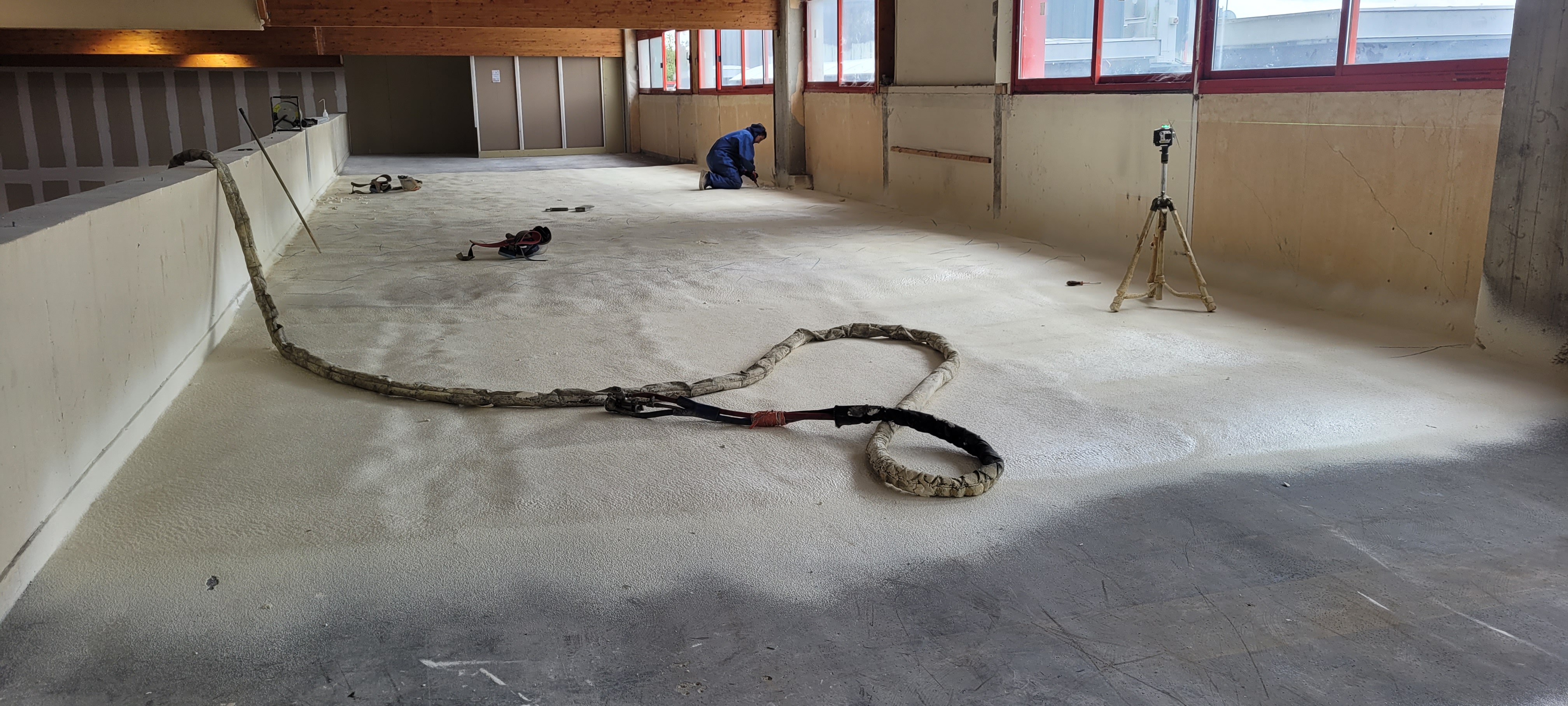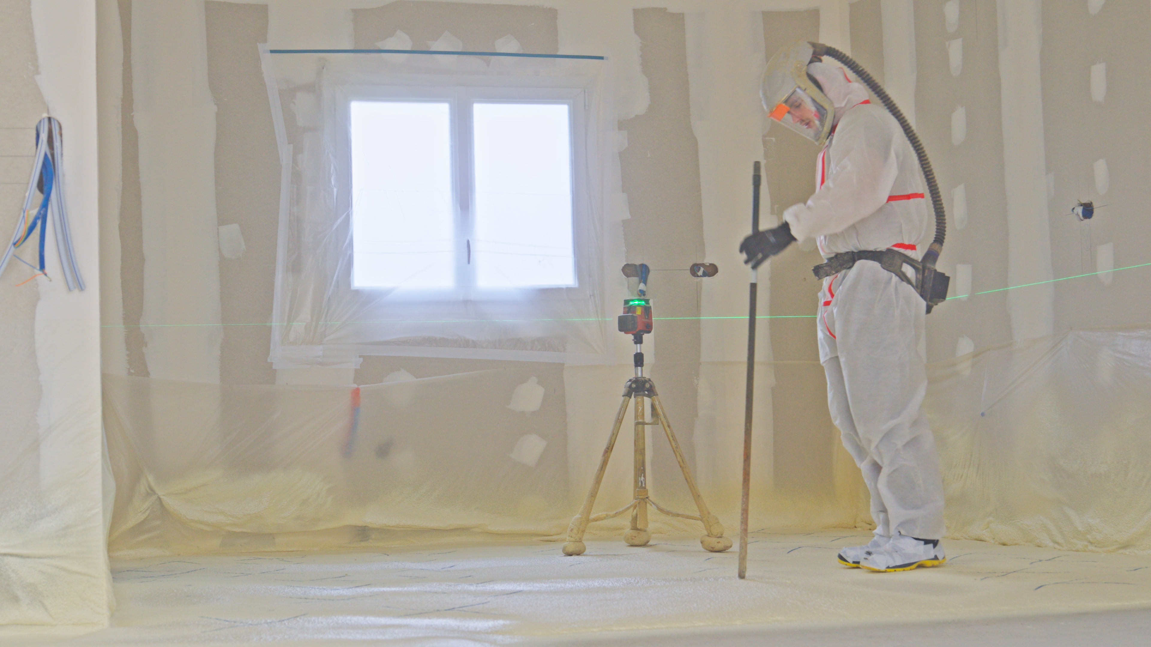 La mousse polyuréthane projetée est aujourd’hui la solution la plus performante pour rattraper et isoler les sols avant la pose d’une chape.